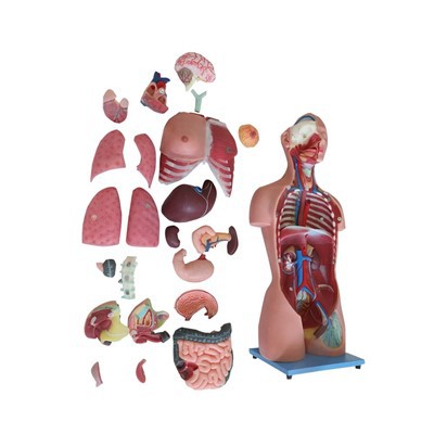 نرم سلیکون 85 سینٹی میٹر یونیسیکس اناٹومیٹک ماڈل انسانی جسم کے اندرونی اعضاء کی پوزیشن اور سر کی جسمانی شکل اور ساخت کو ظاہر کرتا ہے ، جو سانس ، ہاضمہ اور پیشاب کے تین نظاموں کی نمائندگی کرتا ہے۔ کھوپڑی کے دائیں نصف حصے میں کھوپڑی ، ماسٹر پٹھوں اور دنیاوی پٹھوں جیسے ڈھانچے کو دکھایا گیا ہے۔ مدار میں آنکھوں کی بالیاں ہیں۔ سر اور گردن پر ایک سگٹٹل سیکشن لیں۔ کرینیل گہا میں دماغ کا دائیں نصف کرہ ہوتا ہے۔ دماغ کے وینٹرل سائیڈ پر کرینیل اعصاب کے بارہ جوڑے ہیں۔ ناک کی گہا ، زبانی گہا ، اور لارینکس دکھائے گئے ہیں۔ تائرواڈ گلٹی کے پس منظر کے لوبی کے پیچھے پیراٹائیرائڈ غدود دکھائے گئے ہیں۔ سینے میں دو پھیپھڑوں کا فرنٹل سیکشن پھیپھڑوں کی ساخت کو ظاہر کرتا ہے۔ دل کی کورونری اناٹومی بائیں اور دائیں وینٹریکلز کی ساختی مماثلت اور اختلافات کی نشاندہی کرتی ہے۔ بڑے اور چھوٹے خون کی گردش کے اطلاق کی وضاحت کے لئے قلبی نظام میں اوپری اور نچلے وینا کاوا ، پلمونری آرٹیریوونوس ، اور شہ رگ شامل ہیں۔ |